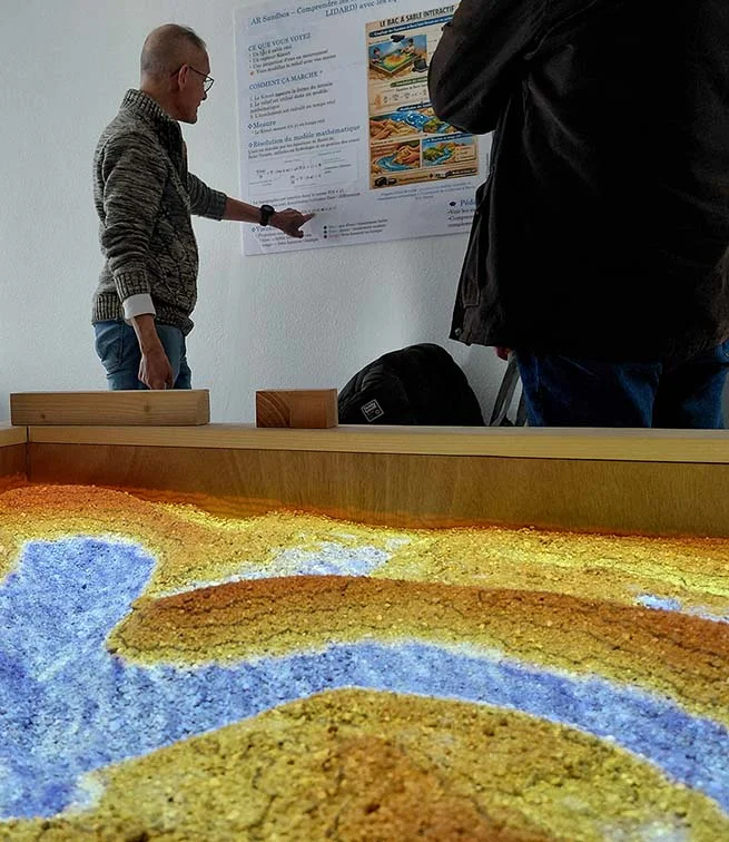 En modelant le sable avec les mains, l’utilisateur modifie le relief. Le capteur mesure en temps réel la topographie (z(x,y)). Ces données sont ensuite intégrées dans un modèle mathématique basé sur les équations de Barré de Saint-Venant, utilisées en hydrologie pour simuler les crues.